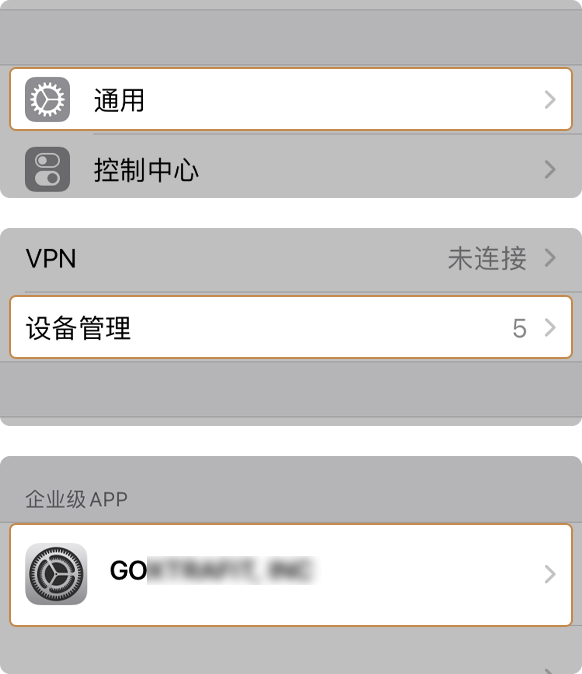 3.则打开手机设置功能,依次进入:通用-设备管理,选择相应的企业级APP。